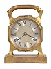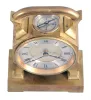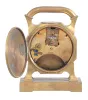France, desk clock, 8 day timepiece with balance wheel movement and directional compass on a brass base supporting an octagonal case on four feet, topped with a handle, c1900. brass case is tarnished, but in good condition Front beveled glass is fine, but smaller one covering the compass is broken with a piece missing. Silvered dials are in good condition and hands are original. Compass needle does not move. Movement ticks briskly, but was not tested long term.