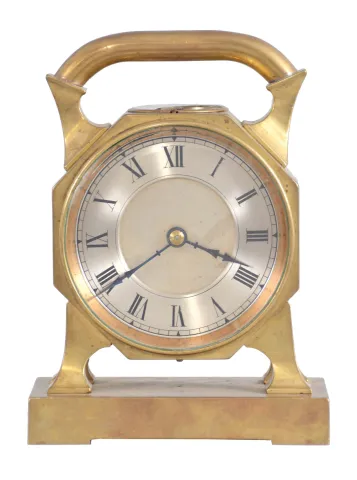 France, desk clock, 8 day timepiece with balance wheel movement and directional compass on a brass base supporting an octagonal case on four feet, topped with a handle, c1900.