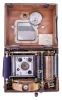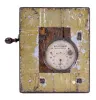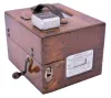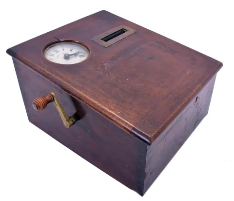 (1) long split in top of mahogany case. Case is unlocked but key is absent. Clock ticks vigorously, but was not tested long term. Punch mechanism works, but ribbon will need to be replaced. Dimensions are for this time recorder; (2) Initials painted on outside of wood case. Duct tape applied to base of case. Comes with three paper rolls. Sold "as is".