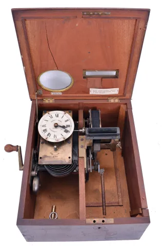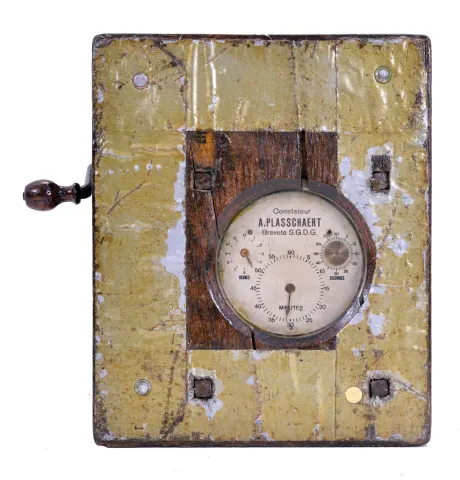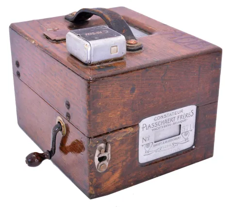 Clocks- 2 (Two) Time Recorders: (1) English 8 day spring driven movement punch clock with jeweled lever escapement movement stamped "9887", dial signed "Gledhill-Brook Time Recorder, Huddersfield, Eng." in a walnut case, c1900; (2) Belgian pigeon timer by Plasschaert Freres, No. 3714, c1905. (1) long split in top of mahogany case. Case is unlocked but key is absent. Clock ticks vigorously, but was not tested long term. Punch mechanism works, but ribbon will need to be replaced. Dimensions are for this time recorder; (2) Initials painted on outside of wood case. Duct tape applied to base of case. Comes with three paper rolls. Sold "as is".