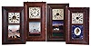 (1) Mahogany veneered case in an old finish has some veneer loss on the outer veneer band. Original tablet has repairs in the center area. Original painted dial has some loss to the printed spandrels. Hands look to be original. Clean label inside the case; (2) Refinished mahogany veneered case has small chip on the upper left OG molding and on the top right side. Original painted dial has soiled areas and some wear. Original hands and tablet with minor loss. Dark, but readable label inside the case; (3) Mahogany veneered case in an old finish has some veneer loss, minor repairs and age cracks in the outer veneer band. Original painted dial has age darkened a little with some minor loss at the mounting pins. Original hands and tablet. Nice label inside the case; (4) Mahogany and rosewood veneered case in an old finish in nice condition. Original painted dial has some wear at the winding arbors and the mounting pins. Original hands and tablet with loss. Dark, but readable label inside the case. Measurement is for the largest clock.