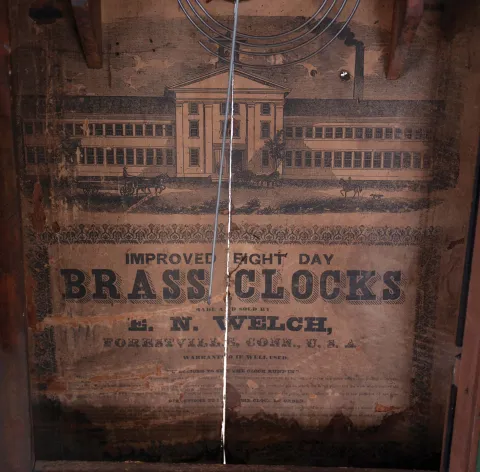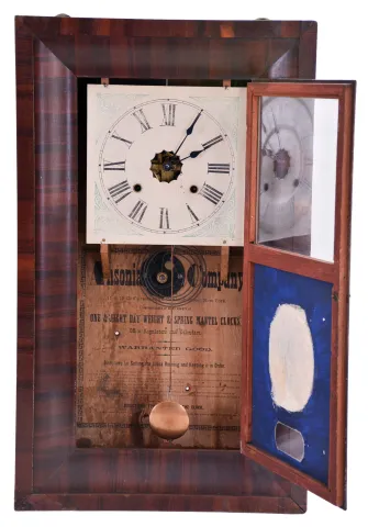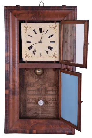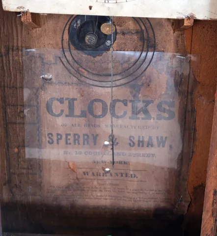 Clocks- 4 (Four): (1) Ansonia Clock Co., New York, NY, 30 hour, time and strike, weight driven brass movement OG shelf clock, c1850; (2) Sperry & Shaw, New York, New York, 30 hour, time and strike, weight driven brass movement OG shelf clock, c1845; (3) E