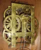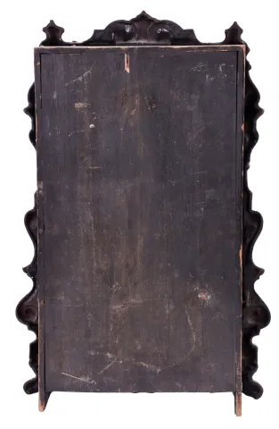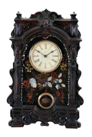 Iron front in original paint and MOP under a dark varnish layer. Original dial has been repainted. Minute hand is replaced. Original label missing gone. Movement is signed New Haven, though the clock may have been sold through the American Clock Co., New York, NY.