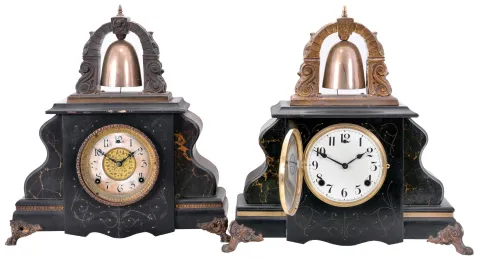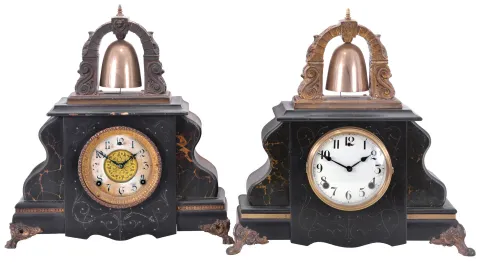 Clocks- 2 (Two): (1) Gilbert Clock Co., Winsted, Conn., "Curfew" shelf clock with an 8 day spring driven time and half hour strike movement in an enameled wood case, c1914; (2) Gilbert Clock Co., Winsted, Conn., "Curfew" shelf clock with an 8 day spring driven time and half hour strike movement in an enameled wood case, c1900. (1) The case, dial and hands are all in good condition. The movement is signed. ***Please Note: The mainspring on the time train is broken. Do not wind the clock.***; (2) The case is in good condition with some areas of loss and abrasion. The dial and hands are original, however the dial shows significant wear and discoloration. The case backboard is missing and the left rear foot is missing. The dial glass is missing as is the pendulum The movement is signed.