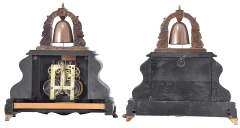 (1) The case, dial and hands are all in good condition. The movement is signed. ***Please Note: The mainspring on the time train is broken. Do not wind the clock.***; (2) The case is in good condition with some areas of loss and abrasion. The dial and hands are original, however the dial shows significant wear and discoloration. The case backboard is missing and the left rear foot is missing. The dial glass is missing as is the pendulum The movement is signed.