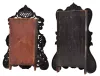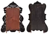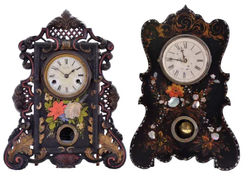 (1) Painted iron front case has some wear to the gold painted areas, some paint loss on the bottom center front and at the bottom access door and some fading loss to one small flower spray. Original paper dial has age darkened and surface abrasion. Original hands. Label inside; (2) Iron front case in nice condition under an aged original finish. The are some scattered small pieces of MOP missing on the outer edge. Original painted dial has scattered loss. Original hands. Glass in the dial door is missing. Small latch on the bottom door is missing. Label inside.
