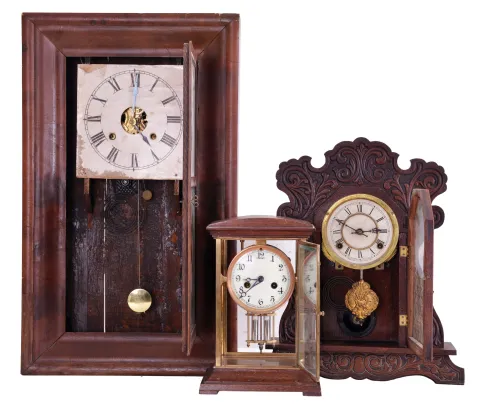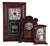 Clocks- 3 (Three) American Mantel: (1) Waterbury Clock Co., Waterbury Conn., crystal regulator, 8 day time and strike, spring driven movement with simulated mercury pendulum in case with wooden top and bottom; (2) Waterbury Clock Co., Waterbury Conn.,