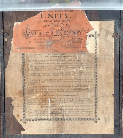 Clocks- 3 (Three) American Mantel: (1) Waterbury Clock Co., Waterbury Conn., crystal regulator, 8 day time and strike, spring driven movement with simulated mercury pendulum in case with wooden top and bottom; (2) Waterbury Clock Co., Waterbury Conn., "Unity", 8 day time and gong strike, spring driven movement shelf clock in a walnut case; (3) William S. Johnson, NY, OOG mantel clock, unsigned 30 hour time and strike weight-driven movement in a mahogany veneered case. (1) No glasses on side or rear of crystal regulator. Wooden parts are scratched; (2) Rear label is mostly complete. Clock ticks and strikes, but was not tested long term; (3) Some missing veneer and damage to door. Dial is a paper replacement. Case has been refinished. Door glass and pendulum bob and modern replacements. No weights. Dimensions shown are for the OOG clock. All clocks sold "as is".