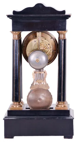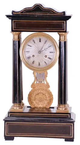 French, Vincenti & Cie, 8 day, time and strike spring driven movement 4-column Empire mantel clock. Ebonized case with contrasting veneer in an original finish, has dings and scratches here and there. Silvered brass dial has some loss to the silver wash. Period hands. Original fancy pendulum. It is possible that this movement was originally in a taller case, as this bottom has been cut out to make room for the pendulum, swinging as shown in slot to keep correct time.