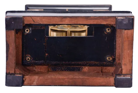 Ebonized case with contrasting veneer in an original finish, has dings and scratches here and there. Silvered brass dial has some loss to the silver wash. Period hands. Original fancy pendulum. It is possible that this movement was originally in a taller case, as this bottom has been cut out to make room for the pendulum, swinging as shown in slot to keep correct time.
