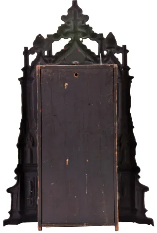 Cast iron case has lost most of its painted decoration on the raised areas and the painted scene is showing its age. The dial and bezel are old, but replaced. Ribbed plate movement is not marked. Replaced hands.