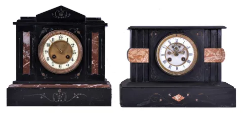 Clocks- 2 (Two) French Black Mantel: (1) 8 day time and gong strike spring driven movement mantel clock with Marti movement with visible Brocot escapement in black slate case with variegated pink marble accents; (2) 8 day time and gong strike spring driven movement mantel clock with black slate case and dark red marble inlay and trim. (1) the heavy stone case is in nice condition with the marble inserts and somewhat faded gold scrolls. There are a few very small corner chips on the front bottom edge. The thick beveled glass and white enamel dial are fine. Red stone pallets are present. The round movement ticks and strikes but was not tested long term; (2) black slate case is in good condition with the red marble inserts and faded gold scrolls. There are a few small corner chips on the front top edge. The beveled glass is fine. There are a few hairlines in the porcelain dial ring. The round movement ticks and strikes but was not tested long term.