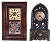 Clocks- 2 (Two): (1) American iron cased shelf clock with gold ornamentation on a japanned base and mother of pearl inlay with an 8 day spring driven time and strike movement by Miles Morse, Jr., Plymouth Hollow, Conn., c1852; (2) Elisha Manross, Bristol,