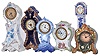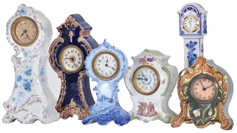 Clocks- 6 (Six): All with ceramic cases, including "R.S. Prussia", "Rosenthal", Majolica, and Delft, five with thirty hour timepiece movements, and one with quartz movement, Rosenthal case dimensions listed