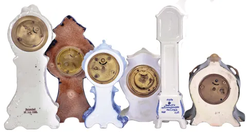 Clocks- 6 (Six): All with ceramic cases, including "R.S. Prussia", "Rosenthal", Majolica, and Delft, five with thirty hour timepiece movements, and one with quartz movement, Rosenthal case dimensions listed Majolica clocks running, the others with good staffs, quartz clock not running