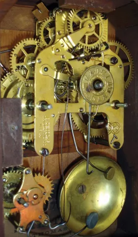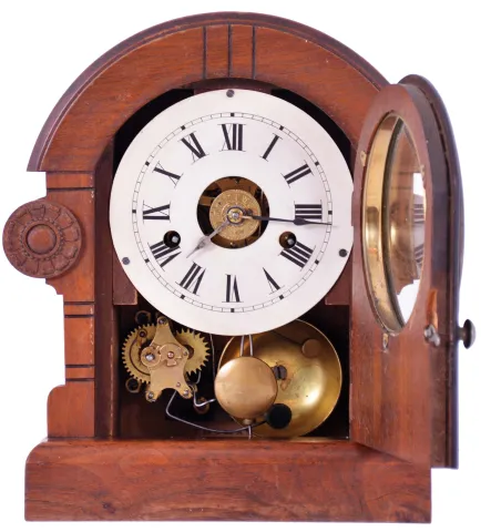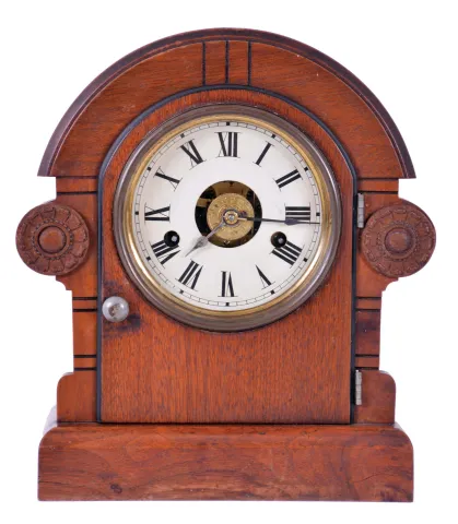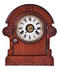 Seth Thomas Clock Co., Thomaston, Conn. with a spring driven 30 hour time, strike and alarm movement shelf clock in a mahogany veneered case.