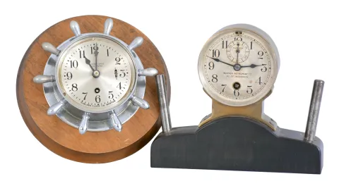 Clocks- 2 (Two) Chelsea: (1) Chelsea Clock Co., Boston, Mass., for Albert Dyke, New York, "Manhattan" instrument board clock, 8 day timepiece in a nickel case taking the form of a yacht wheel with 2.75 inch dial, serial number 573624, c1952. (2) Chelsea