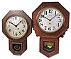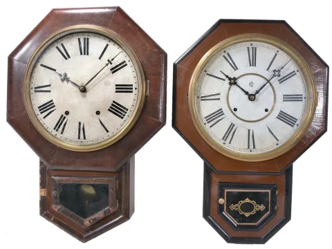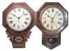Clocks- 7 (Seven) American school house spring driven wall clocks including, Seth Thomas, Sessions, New Haven, Waterbury, Ansonia with advertising for "H.Z. Rhoads & Son, Lancaster PA", etc. including one case only in pressed oak with bezel sold "as is". All have movements and pendulums. The Sessions is slightly larger and clean.