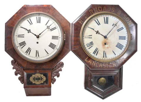Clocks- 7 (Seven) American school house spring driven wall clocks including, Seth Thomas, Sessions, New Haven, Waterbury, Ansonia with advertising for "H.Z. Rhoads & Son, Lancaster PA", etc. including one case only in pressed oak with bezel
