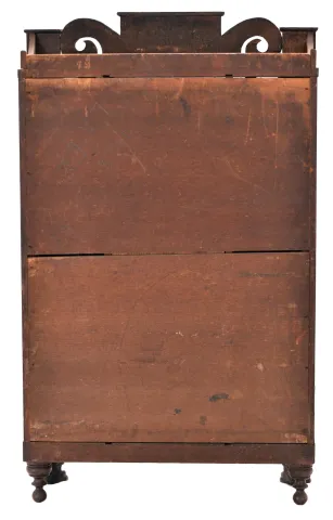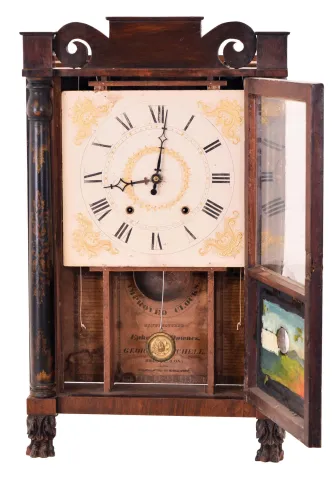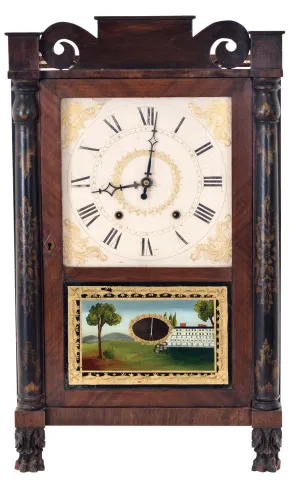 Mahogany and mahogany veneered case in an old finish. Original stenciling on the columns. Splat is an incorrect shape replacement. Outer toe on each carved foot is broken off. Original dial in nice condition. Key escutcheon has been replaced. Tablet has some age and repairs and painted on original glass, but not original.