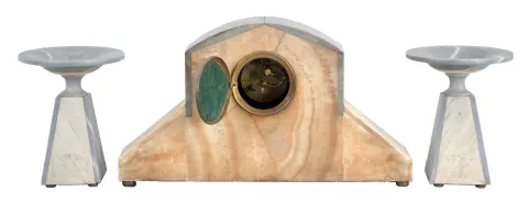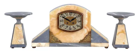 French, F. Marti, 3 piece mantel garniture set with 8 day, time and strike, spring driven movement in a multi color onxy Art Deco case, white base with gray marble top, sides, and front panels, brass ornaments, silvered dial with patterned center, and matching marble tazze, c1920. heavy marble case is in good conditon with some very small chips along the lower edge and front corners. Silvered dial is worn nearly to brass along the top. Beveled glass is fine. Movement ticks and strikes but was not tested long term.