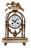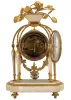 French: Merra, Paris, mantel clock, 8 day, time and strike, count wheel and bell movement with silk thread suspension by Vincenti & Cie., Paris. White marble case with gilt hardware, fluted columns and twisted arched supports, the top with large gilt
