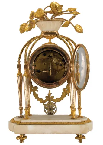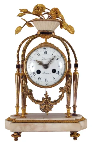 French: Merra, Paris, mantel clock, 8 day, time and strike, count wheel and bell movement with silk thread suspension by Vincenti & Cie., Paris. White marble case with gilt hardware, fluted columns and twisted arched supports, the top with large gilt roses in bloom. Signed white porcelain dial with Roman numerals. The marble elements of the case have some very fine chips along the edges. Porcelain dial is good, but for two cracks and a small missing piece above the XII. The garland below the dial looks appropriate, but is likely a later addition. Front and rear convex beveled glasses are in good condition as are the hands. Some of the twisted arches are loose and could use attention. The Vincenti movement has the Medaille d'Argent, 1855 stamp. The movement ticks and strikes, but was not tested long term.