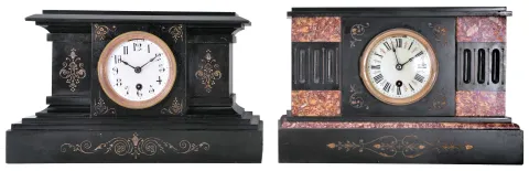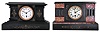 Clocks- 2 (Two) Boston Clock Co. Black Mantel: (1) 8 day spring driven movement with single arbor winding time and strike brass lever movement in black slate case with red marble accents, c1890; (2) 8 day spring driven movement with single arbor winding time and strike brass lever movement in black slate case, c1890. (1) Slate case is in very good condition as are the dial and hands. Beveled glass as a small chip on the edge. Movement is signed. Rear spring barrel is numbered "8991 S "; (2) Case is in very good condition. Beveled glass and hands appear to be original. There is a small chip in the top of the porcelain dial. Movement is signed. The rear spring barrel is numbered "3756 S". Both movements tick and strike, but were not tested long term.