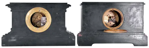 (1) Slate case is in very good condition as are the dial and hands. Beveled glass as a small chip on the edge. Movement is signed. Rear spring barrel is numbered "8991 S "; (2) Case is in very good condition. Beveled glass and hands appear to be original. There is a small chip in the top of the porcelain dial. Movement is signed. The rear spring barrel is numbered "3756 S". Both movements tick and strike, but were not tested long term.