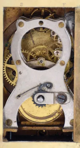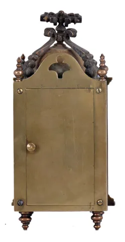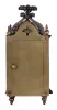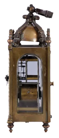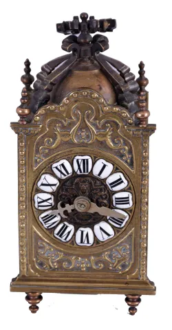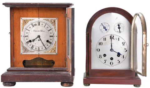 Clocks- 3 (Three) German Bracket: (1) German for Kents' Limited, Toronto, bracket clock, 8 day, time & Westminster chime in round top mahogany case with subsidiary indicators for chime and fast/slow adjustment, c1910; (2) German, bracket clock, 8 day, time & Westminster chime playing on coiled gongs by a second spring driven movement in an oak case, c1910; (3) German, carriage clock, 8 day time only movement with enamel cartouche numerals in the style of a late 16th century clock. (1) The case has its original finish, and the thick beveled front glass is fine. The silvered dial is tarnish in spots with scratches around the winding arbor holes. The square unsigned movement ticks and chimes, but was not tested long term; (2) the oak case has many areas of lost finish. Wood panel behind the dial is cracked. A large element on the top of the clock is missing. The movement will need attention; (3) Tarnish on case. Mainspring will need attention. Sold "as is".