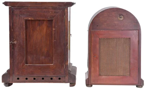 Clocks- 3 (Three) German Bracket: (1) German for Kents' Limited, Toronto, bracket clock, 8 day, time & Westminster chime in round top mahogany case with subsidiary indicators for chime and fast/slow adjustment, c1910; (2) German, bracket clock, 8 day,