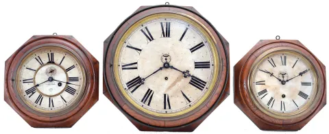 Clocks- 3 (Three): (1) Ansonia Clock Co., New York, NY, "8 Inch Octagon Lever" wall clock with a spring driven 30 hour lever timepiece movement in an oak case, c1880; (2) Waterbury Clock Co., Waterbury, Conn., "12 Inch Oak Lever" wall clock with a spring driven, 8 day lever timepiece movement in an oak case, c1914; (3) Waterbury Clock Co., Waterbury, Conn., "8 Inch Oak Lever" wall clock with a spring driven, 8 day lever timepiece movement in an oak case, c1906. (1) The case may have been refinished some time ago and now has a soft lustre appearance. The original paper dial is in very good condition with age darkening and some wear. The hands are original; (2) The case has its original finish. The hands are original. The original painted dial is in good condition but has a darker varnish appearance. There is a nice label on the back of the case; (3) The case has original finish. The original paper dial is in very good condition with some age darkening. The hands are original.