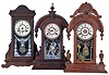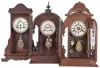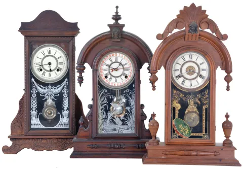 Clocks- 3 (Three): (1) Ansonia Clock Co., New York, unidentified shelf clock with a spring driven, 8 day time and half hour strike movement in an oak case, c1910. ; (2) William L. Gilbert Clock Co., Winsted, Conn., "Parisian - Walnut" shelf clock with a
