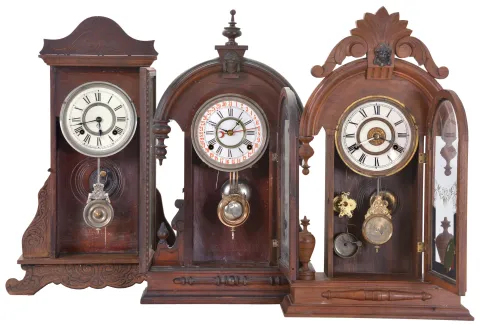 Clocks- 3 (Three): (1) Ansonia Clock Co., New York, unidentified shelf clock with a spring driven, 8 day time and half hour strike movement in an oak case, c1910. ; (2) William L. Gilbert Clock Co., Winsted, Conn., "Parisian - Walnut" shelf clock with a spring driven, 8 day, time and strike movement with a simple calendar mechanism in a walnut case, c1885; (3) New Haven Clock Co., New Haven, Conn., "No. 503" shelf clock with a spring driven, 8 day time, strike and alarm movement in a black walnut case, c1886. (1) The case has been refinished at some point. One side molding has detached and is inside the case. The paper dial may be a later replacement. The hands are period and may be original; (2) The case retains its original finish, The left side lower finial and both upper finials have been broken and are now shortened. The dial and hands are recent replacements. The original door glass is nicely stenciled (3) The case has lost its finish. The dial may be a replacement. The hands are original. The colored, stenciled door glass is original and in very good condition with only minor loss. Note: The dimensions are for clock number; (3) .