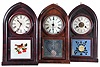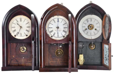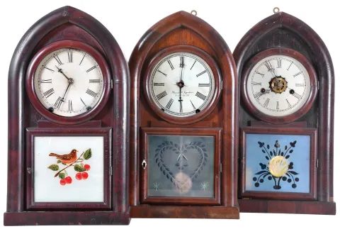 Clocks- 3 (Three): (1) E. N. Welch, Forestville, Conn., Beehive style shelf clock with a spring driven 30 hour time and strike movement in a rosewood veneered case., c1860; (2) Brewster & Ingrahams, Bristol, Conn., Beehive style shelf clock with a spring
