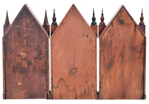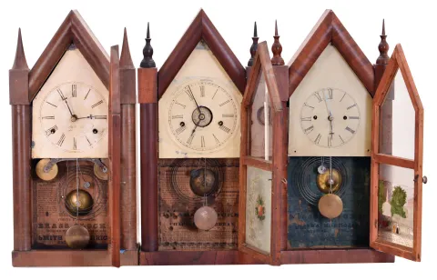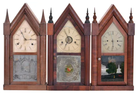 Clocks- 3 (Three): (1) Smith & Goodrich, Bristol, Conn., 30 hour, time and strike spring driven, fusee movement sharp gothic or steeple clock, c1850; (2) Chauncey Boardman, Bristol, Conn., 30 hour, time, strike and alarm spring driven movement sharp