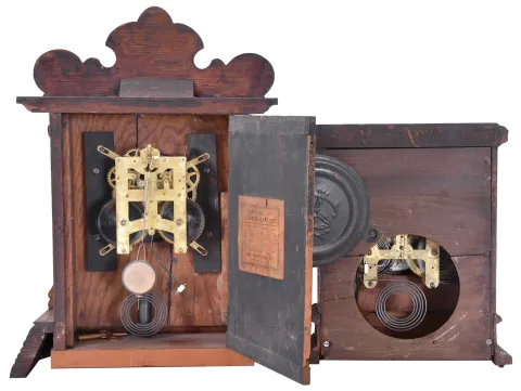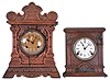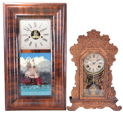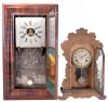 Clocks- 4 (Four) American Wood Case: (1) Seth Thomas Clock Co., Thomaston, Conn., 8 day, time and strike, spring driven movement cabinet clock in oak case with applied metal griffin ornaments, c1892; (2) New Haven Clock Co., New Haven, Conn., "Congressional Line", 8 day, time and strike, spring driven movement cabinet clock in oak case, c1895; (3) Waterbury Clock Co., Waterbury, Conn., "Festus", 8 day, time and strike, spring driven movement gingerbread clock in oak case, c1906; (4) Forestville Manufacturing Company, Bristol, Conn., 8 day, time and strike, weight-driven OOG clock in rosewood veneer case, c1850. (1) Original finish is slightly alligatored in spots. Dial, glass, and hands in good condition (2) Two large cracks run through the front. Newer pine board added to base. Celluloid dial is cracked but complete. Original hands. Complete paper label inside rear door; (3) Top of case was split and repaired leaving a missing chip of wood on the right side. Inner brass dial ring is missing. Original fancy pendulum; (4) Dial is somewhat faded. Pendulum bob not correct. Weights are mismatched. Large inner label is mostly complete. Table is poor replacement.