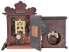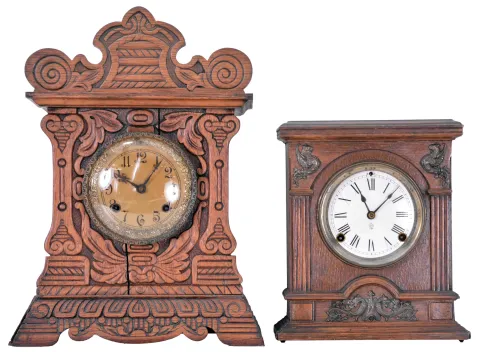 Clocks- 4 (Four) American Wood Case: (1) Seth Thomas Clock Co., Thomaston, Conn., 8 day, time and strike, spring driven movement cabinet clock in oak case with applied metal griffin ornaments, c1892; (2) New Haven Clock Co., New Haven, Conn.,