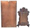 (1) Original finish is slightly alligatored in spots. Dial, glass, and hands in good condition (2) Two large cracks run through the front. Newer pine board added to base. Celluloid dial is cracked but complete. Original hands. Complete paper label inside rear door; (3) Top of case was split and repaired leaving a missing chip of wood on the right side. Inner brass dial ring is missing. Original fancy pendulum; (4) Dial is somewhat faded. Pendulum bob not correct. Weights are mismatched. Large inner label is mostly complete. Table is poor replacement.