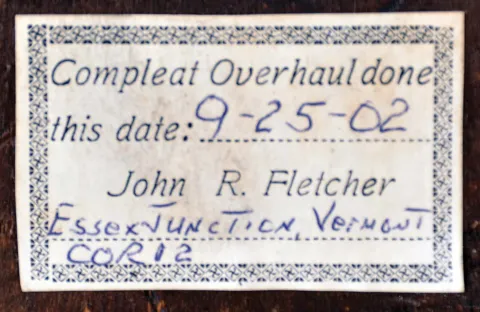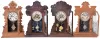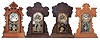 (1) The case has lost its finish. The dial and hands are original. The stenciled door glass is original; (2) The case has lost its finish. The dial and hands are both original. The stenciled door glass is original; (3) The case retains a very dark but original finish. The original paper dial shows wear and discoloration. The hands are correct; (4) The case retains a dark original finish. The are several areas in the top piece where horizontal cracks have been repaired. The dial and hands are original. All four clocks have the same dimensions to within 1 inch.