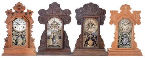 Clocks- 4 (Four): (1) E. Ingraham & Co., Bristol, Conn., unidentified model shelf clock with a spring driven, 8 day, time and strike movement in an oak case, c1895; (2) Wm. L. Gilbert Clock Co., Winsted, Conn., "Dove" shelf clock with a spring driven, 8 day, time and strike movement in an oak case, c1900; (3) The E. Ingraham & Co., Bristol, Conn., unidentified model shelf clock with a spring driven, 8 day, time and strike movement in a oak case, c1915; (4) Waterbury Clock Co., Waterbury, Conn., "Henshaw" shelf clock with a spring driven, 8 day time, strike and alarm movement in an oak case, c1906. (1) The case has lost its finish. The dial and hands are original. The stenciled door glass is original; (2) The case has lost its finish. The dial and hands are both original. The stenciled door glass is original; (3) The case retains a very dark but original finish. The original paper dial shows wear and discoloration. The hands are correct; (4) The case retains a dark original finish. The are several areas in the top piece where horizontal cracks have been repaired. The dial and hands are original. All four clocks have the same dimensions to within 1 inch.