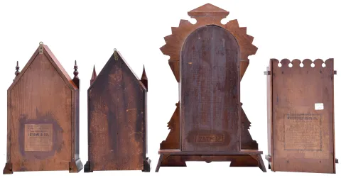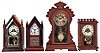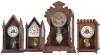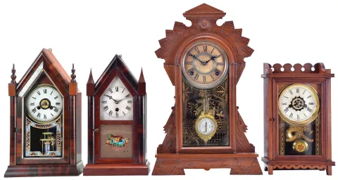 Clocks- 4 (Four): (1) Jerome & Co., New Haven, Conn., "Small Gothic" shelf clock with a spring driven 30 hour time and alarm movement in a rosewood veneered case, c1855. ; (2) E. N. Welch Mfg. Co., Forestville, Conn., "Sharp Gothic" shelf clock with a