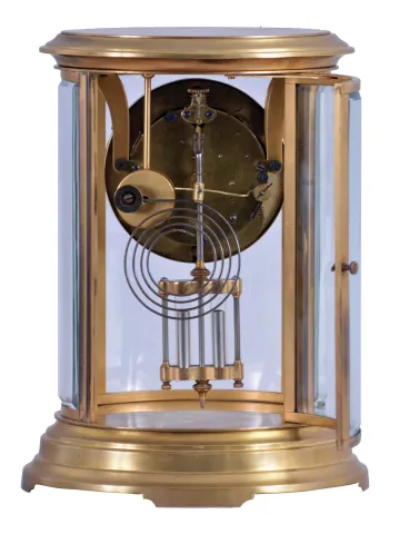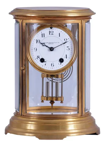 Polished brass case with some remains of original gilding. Original porcelain dial is perfect and original hands. Top decorative knobs on the pendulum have been replaced with nuts. Left side curved beveled glass panel has a couple small chips on the bottom edge. The other glass panels are fine. Movement is stamped "Made in America, USA".