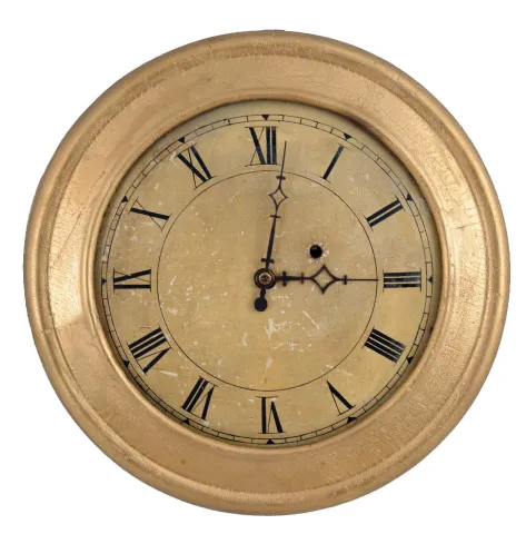 Someone has applied a layer of gold paint over what remains of original gilding. Original painted wood dial has age darkened with some scraps and abrasions. Hands are replacements. Dark, but readable label inside.