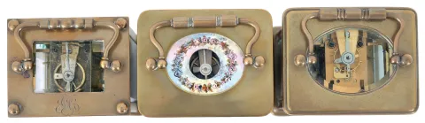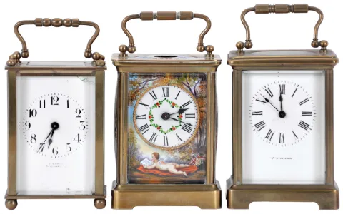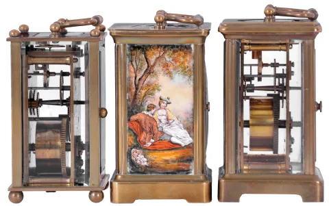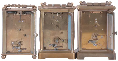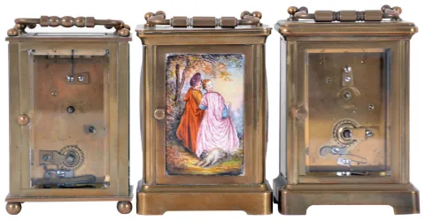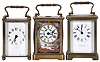 Clocks- 3 (Three) Carriage: All French, all with brass cases, white enamel dials, 8 day, timepiece movements, two with cylinder escapements, one with lever escapement, one with later polychrome enamel panels