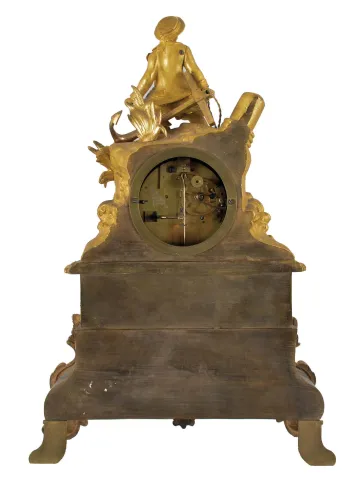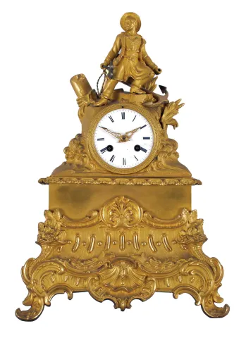 French figural, 8 day, time and strike mantel clock, count wheel and bell, spring driven movement with silk thread suspension in a gilt brass and spelter case depicting a sailor figure. Nice detailed cast metal case with good gold patina and dashing figure of a sailor in front of an anchor. The sailor's axe is slightly bent and the tool that was once in his left hand is missing. The white porcelain dial has many fine hairlines on the right side. Nice original hands This case sat under a glass dome, so never had a front bezel or back door. The clock ticks and strikes, but was not tested long term.