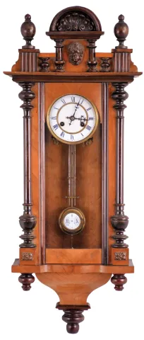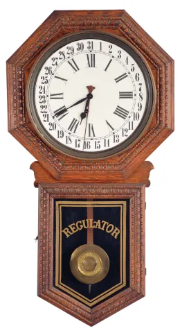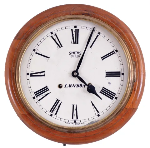 Clocks- 3 (Three) wall clocks: (1) E. Ingraham "Hartford" time only with calendar, pressed oak case; (2) German R/A spring driven in carved walnut case; (3) Smiths, London dial clock