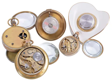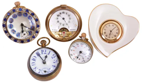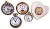 Clocks- 5 (Five): Four paperweight clocks, one an 8 day "Hebdomas", another 8 day Swiss with brilliant set bezel, a 30 hour Swiss with Arabic numeral enamel dial, a New Haven, and a heart shaped "Lenox" with quartz movement