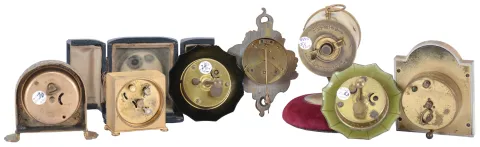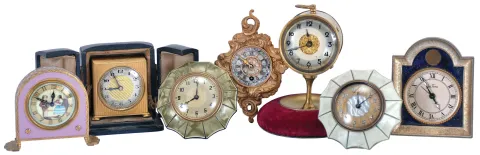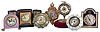 Clocks- 7 (Seven): including two "Lux" parasol novelties, a German alarm with lavender enamel and decorated dial, a miniature cartel style, a Zenith travel alarm with case, a British United novelty with velvet lined base, and a Seth Thomas