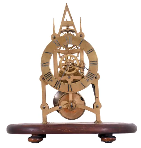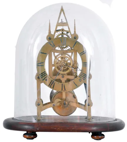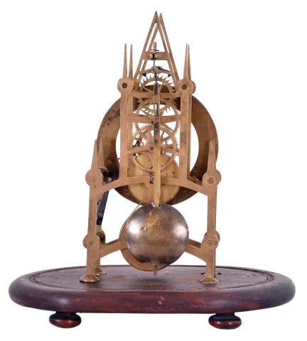 England, small Gothic skeleton clock, the pierced brass frame with 6 turned baluster form pillars, engraved Roman numeral brass dial, blued steel hands, and 8 day fusee timepiece movement, mounted to an oval mahogany base with glass dome. very dirty, frames with minor bends, brass with minor discoloration and tarnish, dial with polish residue, hands with minor oxidation, crutch replaced, pallet repaired, pendulum altered